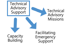 To make sure that all interested stakeholders can benefit from space-based information in the most effective way possible, UN-SPIDER provides Technical Advisory Support to Member States through missions. During these missions, UN-SPIDER meets with key stakeholders in the disaster management community of a country to discuss topic in depth, make recommendations and develop guidelines to improve the use of space-based information for disaster risk management and emergency response. Such missions take place at the invitation of Member States. The three types of Advisory Missions are: Technical Advisory Missions, Institutional Strengthening Missions and Expert Missions.