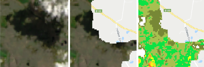 Because this is a change detection process, where data from before and after an event are deducted from each other, also non-fire-related changes in the environment can be detected as wild fire damage. Examples include changes in natural vegetation, deforestation and other land cover changes. Snow, clouds and their shadow are masked in one of the pre-processing steps. Nevertheless, masking algorithms sometimes fail to cover e.g. shadows entirely, which can later lead to false detections. The example below shows a post-fire cloud shadow, which has not been masked completely and was then falsely classified as enhanced regrowth.