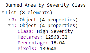 Basic statistics on burned area extent by severity class are implemented in this script. A 'reducer' is employed to count the number of pixels in each class. Besides a simple pixel count, area percentage and area in hectares are listed in the console.