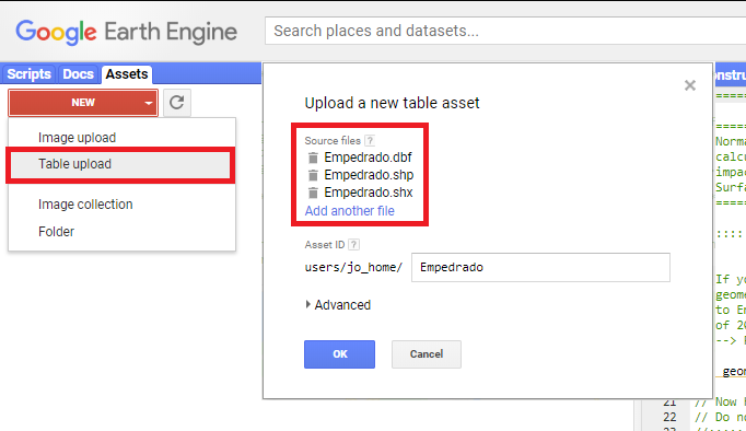 Defining the spatial processing extent with an ESRI-Shapefile (.shp) is the most accurate solution. This is recommended, when researching a very destinct study area (e.g. a watershed). Start the import via the 'Assets'-tab in the top left corner. On the 'New'-drop-down menu select 'Table upload', then select your file. Careful: Make sure also to include the .dbf and .shx files, as the shapefile relies on them.