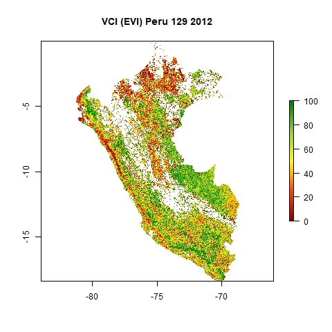 This page provides the step-by-step instructions to apply a multi-temporal analysis of the MODIS-based Vegetation Condition Index (VCI) for large areas using R. Depending on the extent of the study area and the hardware capacities of the computer, the user might experiece difficulties applying the original R script including a cloud mask. We therefore provide an additional R script to be able the compute the VCI and monitor the vegetation conditions for large areas (>200.000km2).