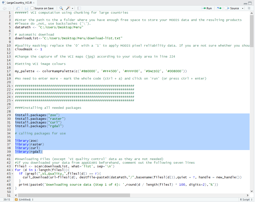 • In line 5: dataPath<-"C:/Users/Desktop/Peru_VCI" --- Enter the path to the folder where you have enough free space to store your MODIS data, the temporary files and the resulting products. It is recommended to use an external hard drive to store your input and output data if possible
