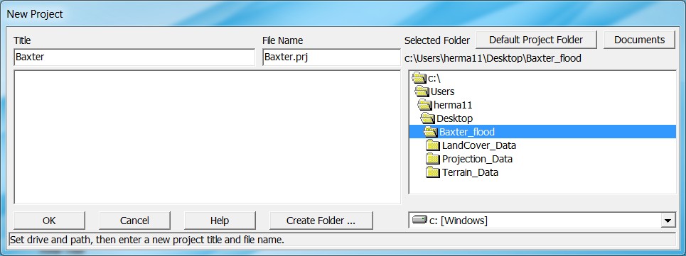 Options→Program Setup→Default Project Folder… select the Desktop folder Baxter_flood