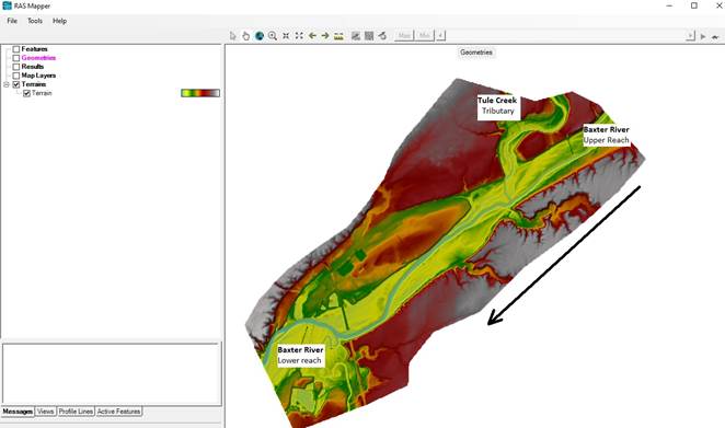 River centerline is used to determine the river network of a HEC-RAS model. Baxter River is flowing from East to West and receives water on the right bank from Tule Creek. Consequently, there are three reaches that are defining the river network: upper Baxter River (Upper reach), lower Baxter River (Lower reach) and Tule Creek Tributary as shown in the Figure below.