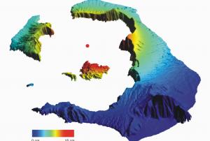 Over the past year and a half, parts of the Greek Santorini islands have risen by 14 cm. Scientists believe that new molten rock has been squeezing up beneath a volcano accumulating in a magma chamber at a depth of about 4 km. Satellite data confirm that the islands have risen as much as 14 cm since January 2011. The Santorini volcano’s last major explosive eruption was about 3600 years ago. In a study published this week in Nature Geoscience, the team discovered that the whole island group has been inflating – slowly rising and moving outward – almost systematically.
