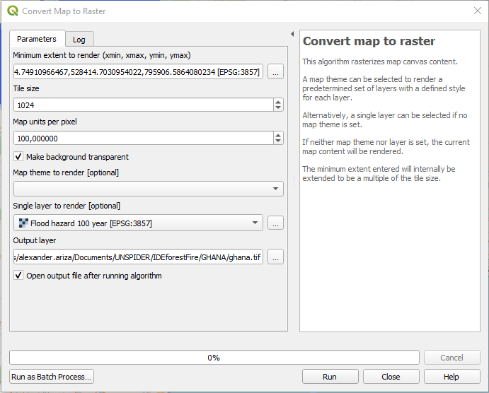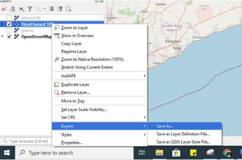 Tenemos que pre-procesar los datos del raster para estar seguros de que el análisis será rápido y no arrojará ningún error. Para ello, se guarda el raster del WMS como un GeoTiff dentro del proyecto QGIS, ya que el análisis de InaSAFE lo requiere para tomar la información desde el disco duro de su dispositivo.