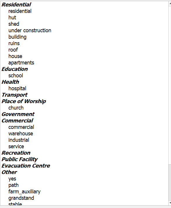 Repita el proceso para las capas de exposición seleccionando “Exposition”, luego “Structures” para la capa de edificios y carreteras para la capa de carreteras. Seleccione “Generic Classification” de estructura para obtener la capa de infraestructuras desde OpenStreetMap o personalice esta clasificación. Distribuya las clases de las casas según su pertenencia y mueva las categorías bastante ambiguas a Otras. Proceda con el asistente “Wizard” como antes y añada una fuente de datos y un título a la capa.