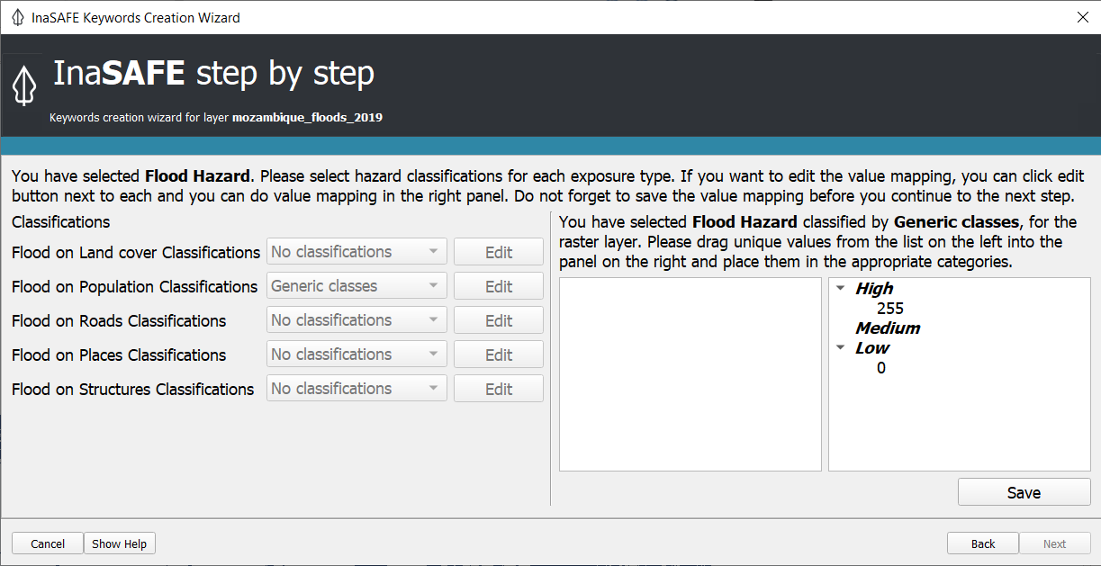 Para el asistente de creación, por favor seleccione "Hazard", luego "Floods", luego "Single Event" y luego Banda 1. Los datos que utilizamos están clasificados, ya que muestran el área inundada y el área no inundada. Luego seleccione las "Generic Classes" para cada población, carreteras y estructuras. Haga clic en guardar y siguiente, agregue "DFO" como fuente de datos y si desea más de los metadatos. Salte la pestaña de información extra y añada el título "Inundaciones en Mozambique 2019". Finalmente haga clic en finalizar.