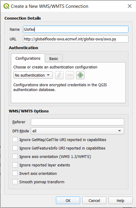 Añadimos una capa de las inundaciónes del 2019 en Mozambique del DFO usando su WMS. Para añadir una capa WMS hacemos clic en la pestaña "Layer", "Add Layer" y después en "Create a New WMS/WMTS Connection". Seleccionamos un nombre y luego agregamos el URL: