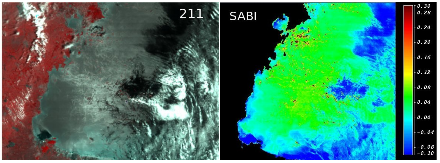 El algoritmo SABI (Superficial Algae Bloom Index) detecta la biomasa que flota en la superficie del agua, que tiene una respuesta similar a la vegetación terrestre (Alawadi 2010). Es una relación de diferencia de banda empírica similar al NDVI, pero incluye específicamente bandas espectrales sensibles al océano; la azul (característica del agua clara) y la verde (característica de la floración de la columna de agua). Para Modis, las bandas corresponden a: B1 (XR = 645 nm) y B2 (XNIR = 869 nm), ambas agregadas del grupo de bandas MODIS de resolución de 250 m; y las bandas B3 (XB = 469 nm) y B4 (XG = 555 nm), respectivamente, disponibles dentro del grupo de bandas MODIS de resolución de 500 m (Alawadi 2010).