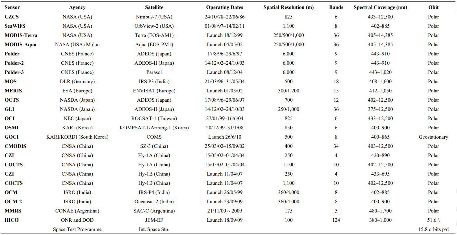 Tabla 2 Características de los sensores de color del océano (Shen, Xu, and Guo 2012)