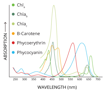 Figura 3. Absorción de luz de los pigmentos algales. Imagen: Fondriest Environmental Inc.