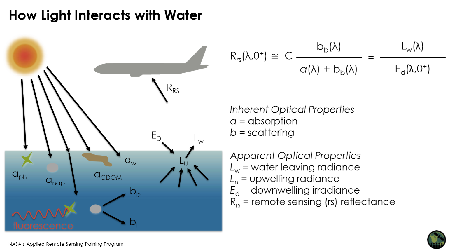Figura 7. Cómo interactúa la luz con el agua. Imagen: Webinar de monitoreo avanzado de agua ARSET de la NASA, septiembre de 2018