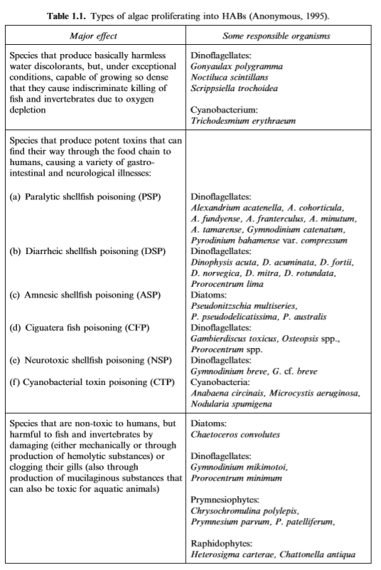 Tipos de algas que proliferan FANs (Pettersson y Pozdnyakov, 2013 Tabla 1.1)