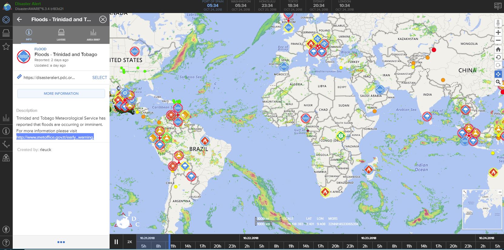 DisasterAWARE es una plataforma integrada del Centro de Desastres del Pacífico, proporciona información consciente sobre la situación, soporte de decisiones e intercambio de información para la gestión de desastres. Las alertas de información de riesgo activo se basan en información de agencias de advertencia creíbles (de acuerdo a los estándares del PDC).