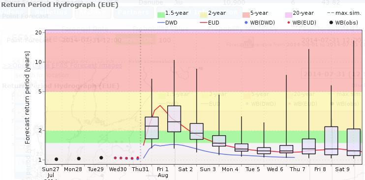 EFAS compara los pronósticos producidos por el flujo del río utilizando varios métodos. Se utilizan pronósticos determinísticos de lluvia del DWD (Deutscher Wetterdienst, Servicio Meteorológico Nacional Alemán) y el Centro Europeo para Previsiones Meteorológicos de Mediano Plazo (ECMWF).