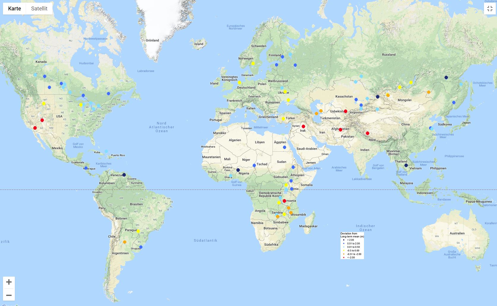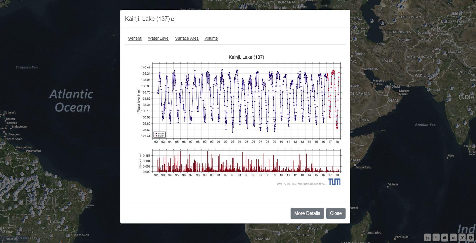 La base de datos para series de tiempo hidrológicas de aguas interiores o continentales analiza datos de los satélites de Envisat, Jason-2 y Sentinel-3, para crear series de tiempo de aguas interiores o continentales. El TU Munich proporciona un mapa web interactivo que muestra los cuerpos de agua que están o fueron cubiertos por la órbita de los satélites anteriormente mencionados. La mayoría de las series de tiempo comienza en 2008 y algunas continúan hasta 2018. El reciente cambio a Sentinel-3 significa que no todas las ubicaciones están disponibles aun, pero los investigadores están abiertos a requerimientos, si un satélite está hoy disponible para cierto objetivo. La metodología se describe con más detalle aquí.