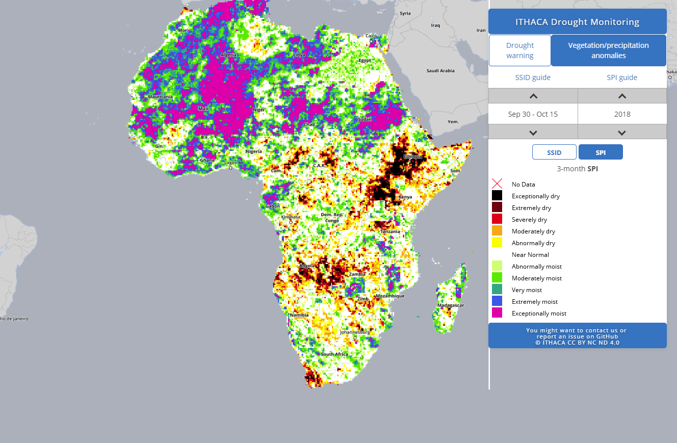 La plataforma ITHACA apunta principalmente a la sequía. Como las inundaciones y sequías dependen de la precipitación, el sitio web también contiene información útil para el monitoreo de inundaciones, ya que el mapa web proporciona un mapa temático del Índice de Precipitación estándar (SPI) de 3 meses. La serie de tiempo de precipitación global (0. 25º resolución espacial), se deriva de la estimación del Análisis de la Precipitación de la Misión Multisatélite de Medición de Lluvias Tropicales (TRMM), calculada en intervalos diarios (datos diarios de TRMM 3B42).