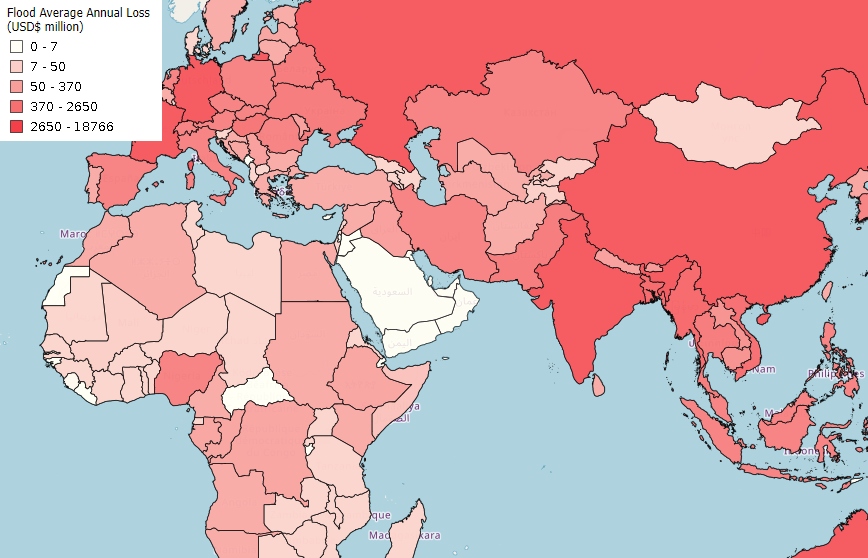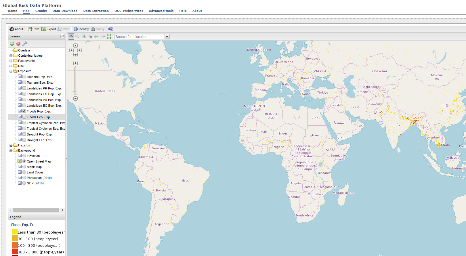 La Plataforma de Datos de Riesgo Global de las Oficinas de Naciones Unidas para la Reducción del Riesgo de Desastres (UNISDR, por sus siglas en inglés), incluye un mapa web interactivo que permite ver los riesgos de inundaciones y las estimaciones de pérdidas relacionadas con las inundaciones y la población expuesta.