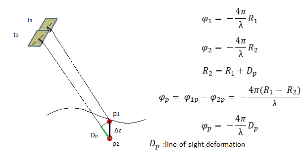 Sobre la base de la configuración interferométrica (imagen) y las relaciones geométricas entre las observaciones de dos fases se pueden derivar las estimaciones de la altura topográfica y la deformación de la superficie. En otras palabras, la fase interferométrica de cada pixel que supone que hay un dispersador dominante que no cambia con el tiempo depende solo de la diferencia en las rutas de viaje de cada uno de los dos SAR (δϕ = 4π ΔRλ)