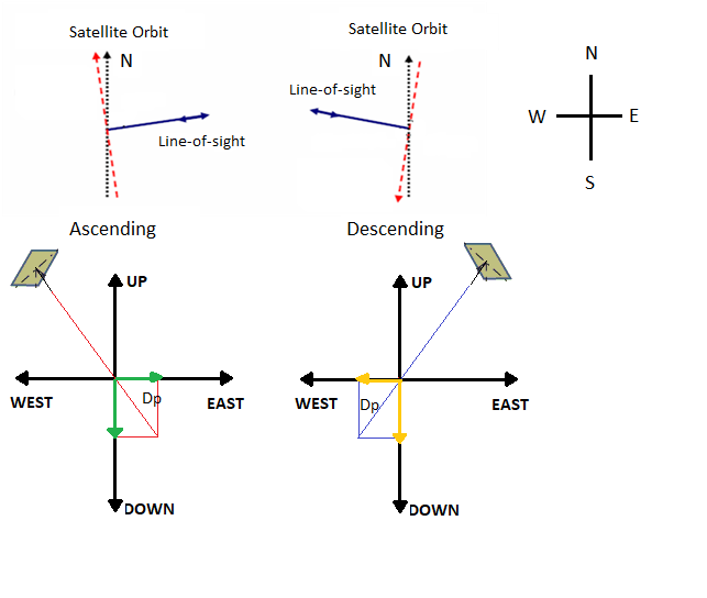 Las geometrías del satélite ascendente (arriba) y descendente(sur) de un satélite de línea de visión (hacia el norte) y la deformación y movimiento del objetivo lejos del radar es un movimiento de subsidencia/hacia el este para órbita ascendente y movimiento de subsidencia/ oeste para órbita descendente