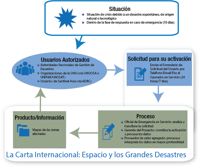 La Carta puede ser activada a petición de los Usuarios Autorizados. Hasta ahora los Usuarios Autorizados son típicamente autoridades de la gestión de desastres que pertenecen a aquellos países cuyas agencias son miembros de la Carta. Los Usuarios Autorizados pueden solicitar la activación de la Carta para contribuir a la respuesta en caso de desastres acontecidos tanto en su propio país, así como en un país con el cual colaboran. UNOOSA y UNITAR/UNOSAT pueden además solicitar la activación del mecanismo en nombre de organizaciones de la ONU para países afectados por grandes desastres.