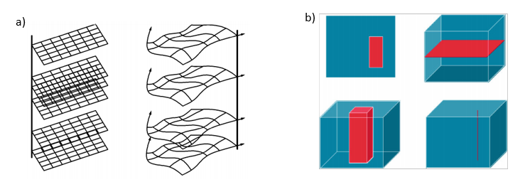 De acuerdo con los requisitos 1 y 7 de las prácticas de normalización del OGC, un cubo de datos geoespacial debe utilizar el modelo de Cobertura Geográfica definido en el Esquema de Implementación de Cobertura (CIS) del OCG, y no permitirá solicitudes que requieran recursos excesivos, pero sí operaciones de recorte y troceado eficientes y rápidas. a) Ejemplo de cuadrícula regular e irregular coherente con el CIS, b) recorte (izquierda) y troceado (derecha) del cubo de datos. Crédito de la imagen: OGC, 2020.