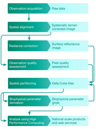 Digital Earth Australia: etapas de procesamiento de datos brutos a productos de valor añadido. Crédito de la imagen: Lewis et al. (2017).