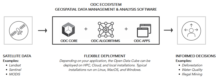 La ODC se está utilizando para satisfacer las necesidades específicas de los usuarios a nivel mundial con el fin de maximizar el impacto de los datos de observación terrestre y abordar el reto de la "ampliación" en muchas economías, presentado en términos de acceso limitado a la descarga de datos, preparación de datos y análisis eficientes de imágenes satelitales. En esencia, la ODC es un conjunto de bibliotecas Python y una base de datos PostgreSQL que ayuda a trabajar con datos ráster geoespaciales (ODC, 2020). La ODC permite un despliegue flexible (desde el ámbito local hasta la nube) de su arquitectura de explotación de datos de libre acceso y facilita la puesta en común de código, herramientas y algoritmos. El ODC puede catalogar grandes cantidades de datos de cualquier proveedor de datos satelitales, que habitualmente se almacenan en formatos de archivo GeoTIFF o NetCDF, pero que pueden incluir cualquier cosa que pueda ser leída por GDAL (Leith, 2019). Además, el ODC sirve de puente entre los datos y las aplicaciones, con un conjunto de herramientas de código abierto y una API basada en Python que permite el acceso y la consulta de datos de alto rendimiento, y aplicaciones que incluyen análisis científicos listos para ejecutar en forma de cuadernos Jupyter (ODC, 2020).