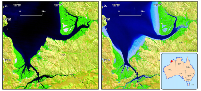 Composiciones del "mejor píxel disponible" de reflectancia superficial media Landsat (1987-2015) de marea alta (izquierda) y marea baja (derecha) sobre una zona de estuario en Australia Occidental. Crédito de la imagen: Lewis et al. (2017)