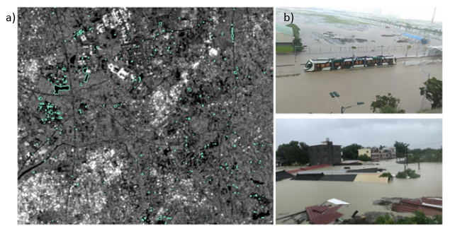 a)Extracción de la zona inundada a partir de la diferenciación multitemporal de retrodispersión de Sentinel-1, b) Zonas inundadas en la ciudad de Tainan, sur de Taiwán. Fuente: Cheng et al. (2019).