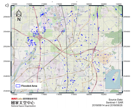 El Cubo de Datos de Taiwán (TWDC) es una aplicación del ODC con un archivo de datos ARD procedentes de sensores como Sentinel-1, Landsat 7, Landsat 9 y dos satélites FORMOSAT gestionados por la Organización Nacional Espacial (NSPO), que forma parte de los Laboratorios Nacionales de Investigación Aplicada (NARLabs) de Taiwán. TWDC se está desarrollando para abordar la reducción del riesgo de desastres a escala regional y nacional, lo que se ejemplifica con el desarrollo de productos de información sobre desastres derivados de TWDC que apoyarán los esfuerzos de Sentinel Asia, una plataforma de cooperación internacional y un mecanismo de emergencia que contribuyen a la gestión de desastres en la región de Asia y el Pacífico (Cheng et al, 2019). Por ejemplo, se demostró la aplicación de TWDC en la respuesta a desastres por inundaciones utilizando datos de Sentinel-1 para la generación rápida de un mapa de una zona urbana inundada. Tras un período de precipitaciones extremas e inundaciones en el sur de Taiwán el 26 de Agosto de 2018, se aplicó la diferenciación multitemporal de retrodispersión de radar en dos imágenes de radar de apertura sintética (SAR) adquiridas el 14 y el 26 de Agosto de 2018, respectivamente (Cheng et al, 2019). Dado que el coeficiente de retrodispersión del agua suele mostrar valores más bajos en relación con otros objetos terrestres como resultado de sus propiedades de reflectancia en el rango espectral de las microondas, se pudo extraer la zona inundada y no inundada aplicando un umbral a la diferencia de retrodispersión entre las imágenes anteriores y posteriores a la inundación (Cheng et al, 2019).