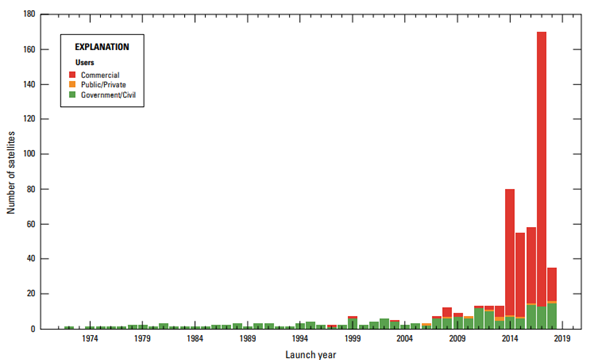 El aumento de los lanzamientos de satélites, en particular del sector comercial, está incrementando drásticamente el alcance de los datos de teledetección disponibles. Crédito de la imagen: Christopherson, Chandra & Quanbeck (2019).