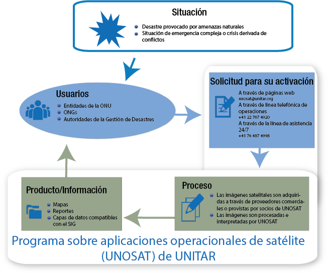 La activación del mecanismo UNOSAT puede solicitarse en caso de desastres provocados por amenazas naturales, situaciones de emergencia complejas o crisis derivadas de conflictos. Los servicios incluyen la rápida adquisición y procesamiento de imágenes satelitales para generar información geoespacial e informes analíticos además de capas de SIG con el fin de apoyar a los organismos de ayuda humanitaria.