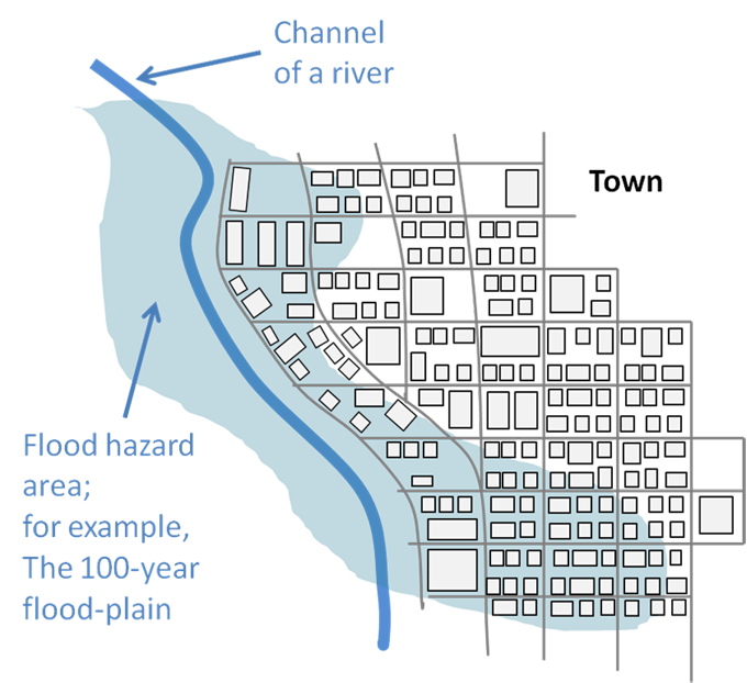 Imagine un pueblo que ha sido establecido a las orillas de un río. Por medio de un análisis hidráulico, los hidrólogos pueden identificar y delinear el área propensa a inundaciones en las orillas de un segmento específico del canal del río. En algunos países, tal área amenazada demarca la extensión geográfica de aquellas inundaciones que tengan un periodo de retorno o recurrencia de 100 años. Toda infraestructura que esté localizada dentro de esta área estará expuesta a las inundaciones. Tanto los ingenieros civiles, así como otros expertos de las áreas de las ciencias sociales y económicas, podrán evaluar el grado de vulnerabilidad de la infraestructura que esté localizada dentro de esta área y por ende podrán evaluar los riesgos combinando la información relacionada con la amenaza de inundaciones, los elementos que están expuestos y sus grados de vulnerabilidad.