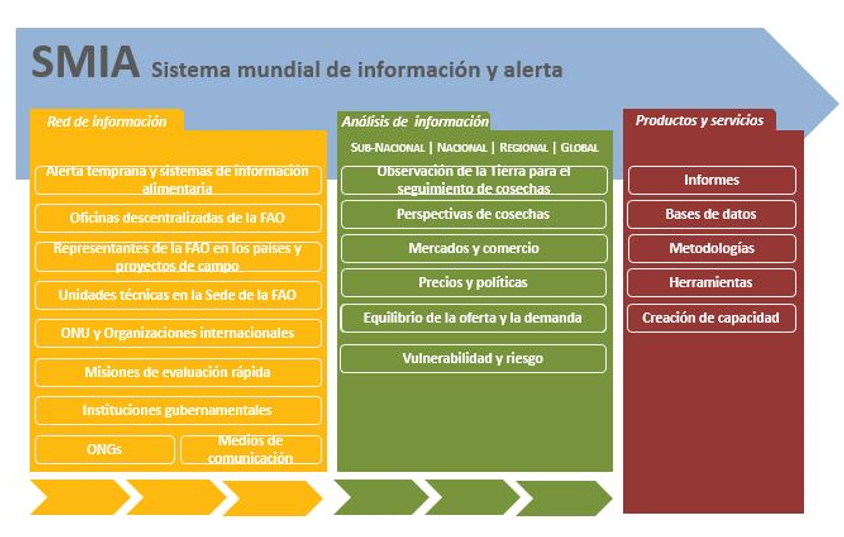 Desde hace varias décadas y para responder a las crisis alimentarias de los 1970s, el Comité de Seguridad Alimentaria Mundial decidió establecer el Sistema Mundial de Información y Alerta (SMIA). El SMIA compila y revisa datos sobre una variedad de temas incluyendo la producción y comercialización de alimentos, el consumo, la oferta y la demanda de alimentos a nivel mundial para determinar las condiciones potenciales de inseguridad alimentaria en países alrededor del mundo.