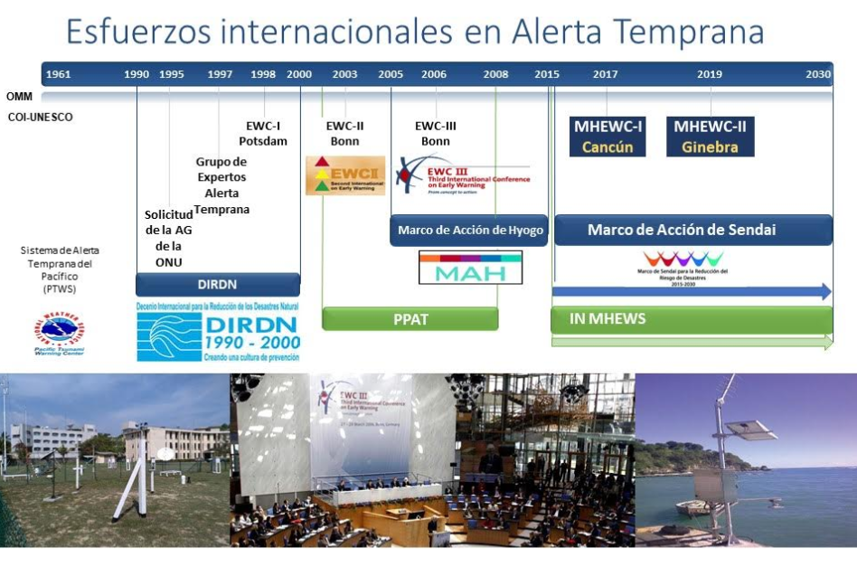 El primer esfuerzo por parte de Naciones Unidas en este tema de alerta temprana se llevó a cabo por parte de la Comisión Oceanográfica Intergubernamental de la UNESCO (COI-UNESCO). La COI coordinó los esfuerzos de los países con costas en el océano Pacífico para implementar el sistema de alerta temprana en caso de maremotos o tsunamis después del maremoto de Valdivia en Chile en 1960. Posteriormente, la COI de la UNESCO ha usado esta experiencia del sistema del Pacífico para lanzar sistemas similares en el océano Índico, el Atlántico Norte, el Mediterráneo y el Caribe.