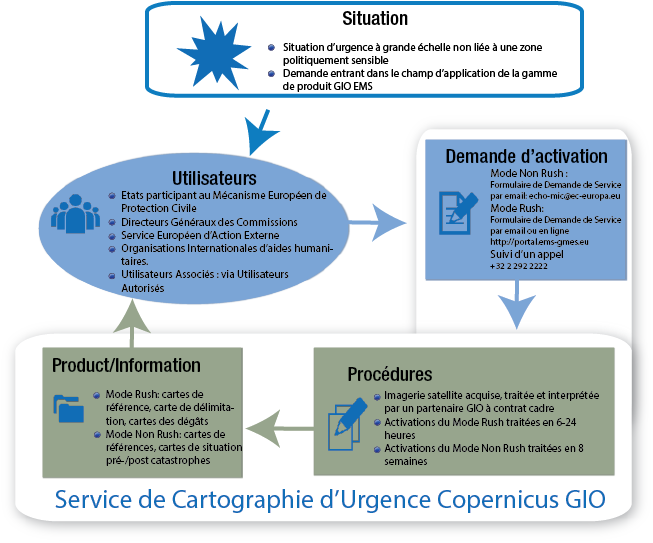 Les utilisateurs autorisés peuvent activer le service en envoyant directement un Formulaire de Demande de Service (SRF) au Centre d’Intervention d’urgence (ERC/MIC) de l’Office Humanitaire de la Communauté Européenne (ECHO) au sein de la Commission Européenne. Il existe deux modes d’activation : le Mode Rush lorsqu’il faut fournir rapidement (en heures ou en jours) des informations géospatiales afin d’appuyer les activités de gestion de situation d’urgence immédiatement après l’évènement. Le Mode Non Rush quand il faut fournir des informations géospatiales pour appuyer des activités qui ne nécessitent pas d’intervention immédiate. Ce mode est applicable lors des phases de prévention, de préparation et de redressement. Les Utilisateurs Autorisés déclenchent le mécanisme en contactant le service ou par email (echo-mic [at] ec.europa.eu (echo-mic[at]ec[dot]europa[dot]eu)). Les activations du Mode Rush peuvent également être demandées sur le site web (http://emergency.copernicus.eu/). Chaque demande doit être suivie d’un appel à l’ERC/MIC (+32-2-292-2222).