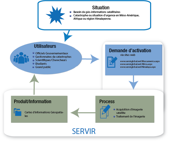Le mécanisme SERVIR est une association entre la NASA et l’Agence des Etats-Unis pour le Développement International (USAID) qui intègre les observations par satellite, données terrestres et des modèles de prévisions pour aider les états d’Amérique Centrale, Afrique de l’Est et de l’Himalaya à évaluer les menaces environnementales et y répondre ainsi qu’à évaluer les dégâts causés par les catastrophes naturelles. SERVIR est un mécanisme multi-agences, multi-gouvernemental avec plus de 30 partenaires et collaborateurs et est appuyé par les gouvernements d’Amérique Centrale, Afrique et la région Himalaya Hindu-Kush d’Asie. Son Bureau de Coordination se trouve aux Etats-Unis et est soutenu par trois centres régionaux : le Centre Régional de Cartographie des Ressources pour le Développement (RCMRD) au Kenya, le Centre International pour le Développement Intégré des Montagnes au Népal et le Centre Aquatique pour les Tropiques Humides d’Amérique Latine et Caraïbes au Panama.