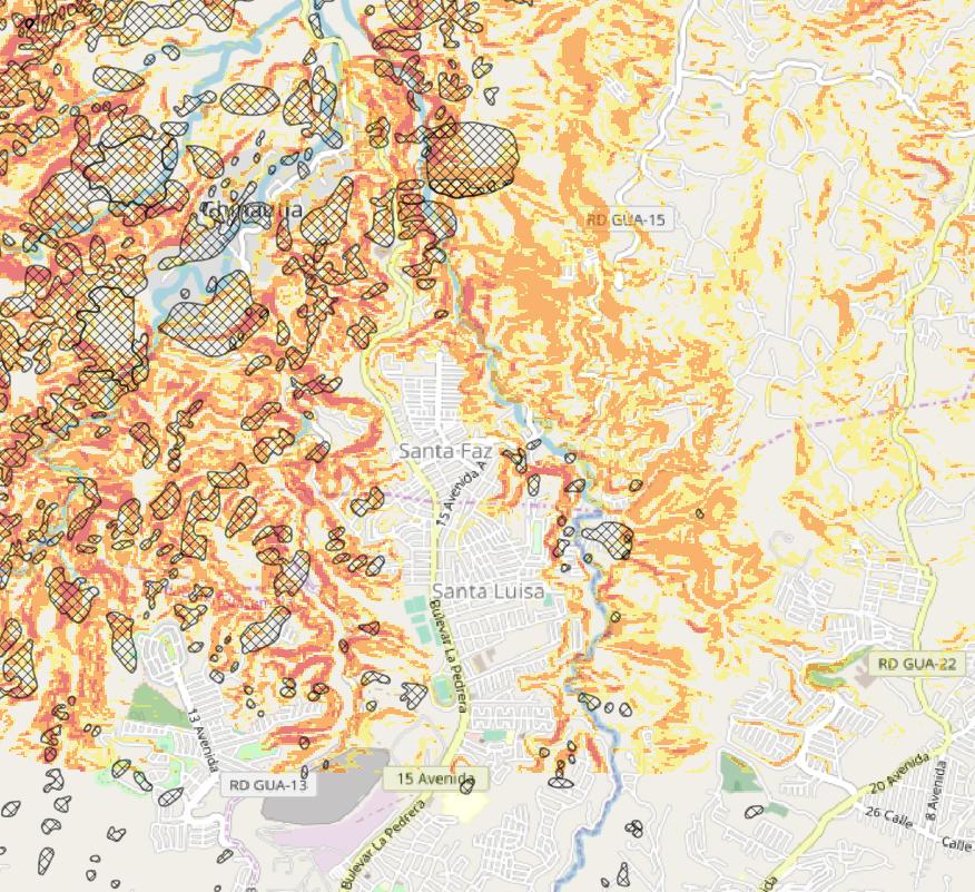 On 4 February 1976, a strong 7.6 magnitude earthquake impacted large parts of the country, killing more than 23,000 inhabitants. The earthquake triggered a large number of landslides in the highlands of the country, as well as in many ravines in the Greater Metropolitan Area of Guatemala City. Figure 5 presents the location of several of those landslides near Chinautla and the landslide hazard map developed using the WorldDEMTM.
