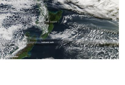 By June 13, when the Moderate Resolution Imaging Spectroradiometer (MODIS) on the Aqua satellite acquired these images, a concentrated plume was visible more than half a world away over Australia and New Zealand. The top image shows the ash plume over southern Australia and the Tasman Sea, while the lower image provides a view farther east over New Zealand and the South Pacific Ocean.