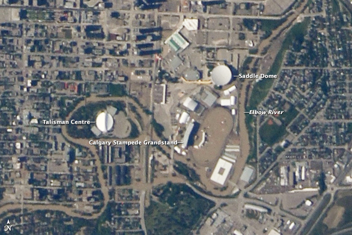 NASA specified: "The top photo was acquired on June 22, near the height of the flooding around the Saddledome and the venue for the Calgary Stampede. The lower image from June 24 shows sediment and debris deposited around the city as the waters receded. (Turn on the image comparison tool to see the difference.) Note that the June 24 image is slightly blurry because the ISS was passing slightly to the east, and the city was not centered below the fixed, downward pointing camera. Larger, downloadable images (linked beneath each image above) show the floodwaters from both the Bow and Elbow Rivers inundating the wider Calgary metropolitan area."