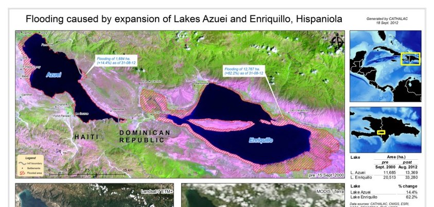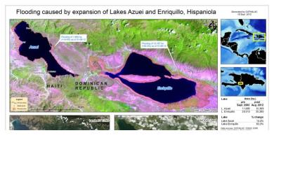 UN-SPIDER's Regional Support Office CATHALAC (Water Center for the Humid Tropics of Latin America and the Caribbean) conducted a satellite-based analysis of floodings caused by the lakes Azuei in Haiti and Enriquillo in the Dominican Republic. As indicated recently by the Associated Press (AP), the expansion of these lake has caused flooding of neighboring farmland, and consequently, significant damage in both countries
