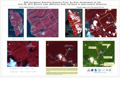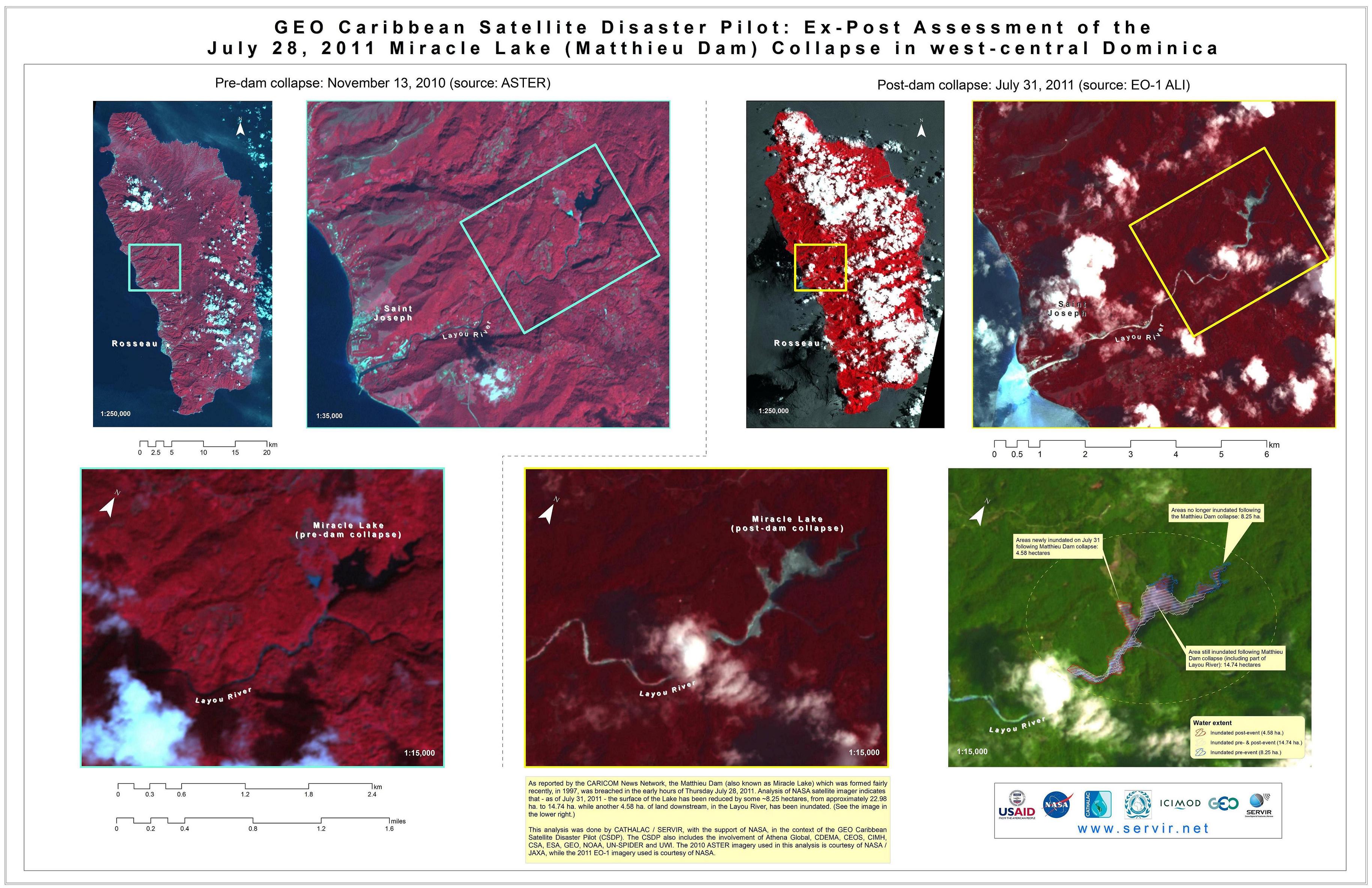 In the early morning of July 28, 2011, Dominica's Matthieu Dam was breached, damaging infrastructure downstream in the Layou River valley. In the context of the ongoing Caribbean Satellite Disaster Pilot, an initiative involving a host of entities including the Caribbean Disaster & Emergency Management Agency, CATHALAC, NASA, UN-SPIDER, and others, recently completed an assessment of the Matthieu Dam collapse. That assessment indicates that the collapse of the Matthieu Dam reduced the Miracle Lake's surface by some ~8.25 hectares, and as evident in the July 31, 2011 imagery, the banks of the Layou River below the Dam were also breached, putting an additional 4.58 hectares of land under water.