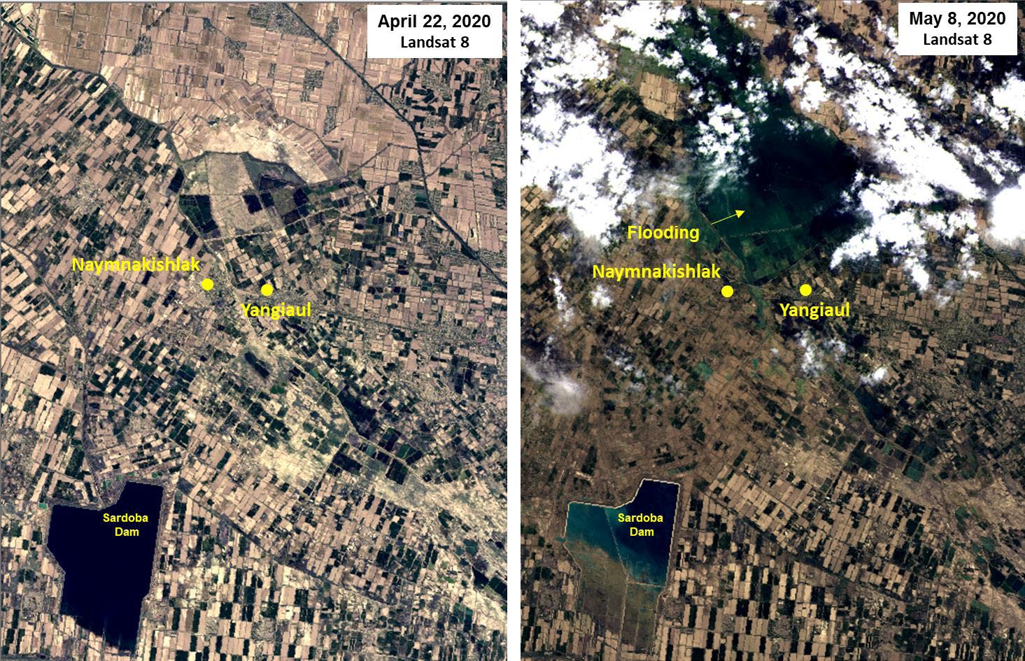 Using space-based information, the Centre for Space Science and Technology Education in Asia and the Pacific (CSSTEAP) affiliated to the United Nations has analysed the recent failure of a dam around the Sardoba Reservoir in Uzbekistan. Following a week of heavy rain in the region, the wall of the dam broke on 1 May and flooded surroundings in Uzbekistan as well as Kazakhstan to the north. According to media reports, the breach led to the evacuation of thousands of people in the area.