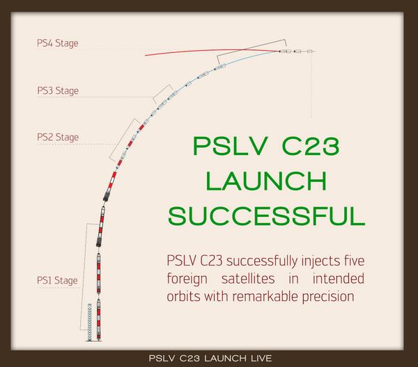 The launch vehicle also carried five other smaller satellites along with SPOT-7: Canada’s CanX-4 and CanX-5, Germany’s AISSat-1, and Singapore’s two-satellite experiment VELOX-1." Various political leaders congratulated ISRO on the successful launch.