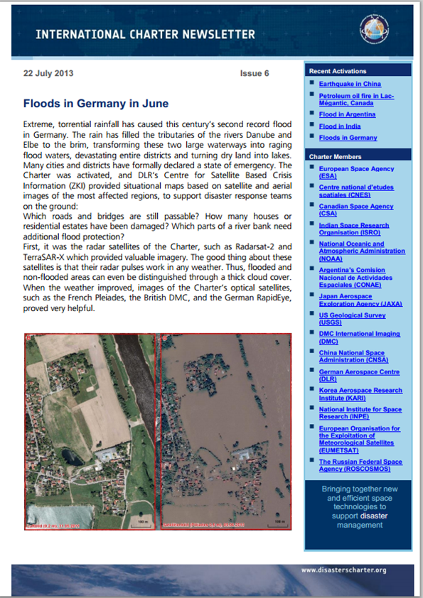 • Floods in Germany in June: The article overviews the floods suffered by Germany in June 2013 and the important role that radar and optical satellites played on the disaster management