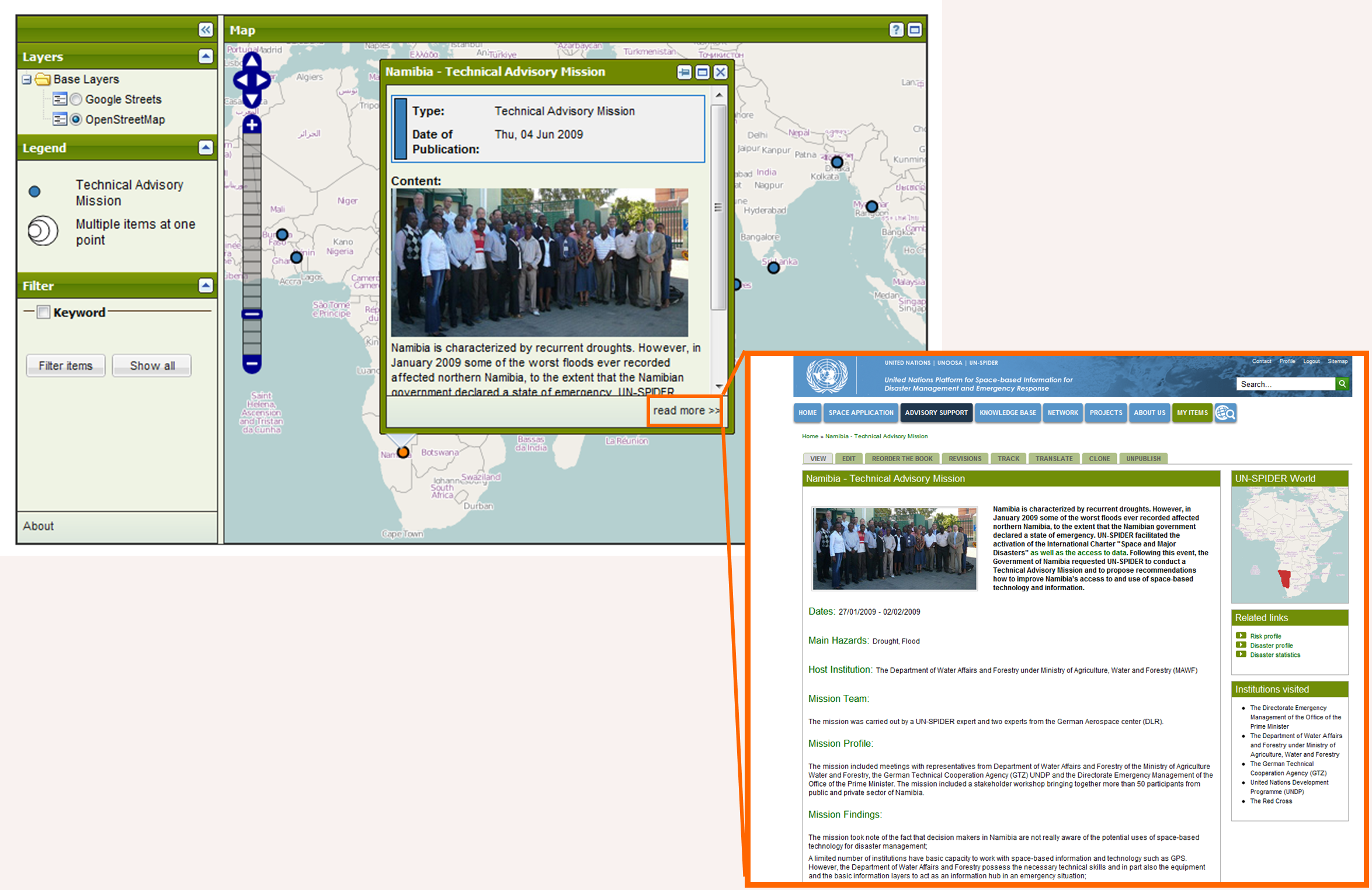Interested users can browse through accomplished missions on a world map, by geographic location, by keyword search or by mission type. The scope and the relevance of UN-SPIDER's Advisory Missions are highlighted by a comprehensive presentation of background facts, mission observations and recommendations.