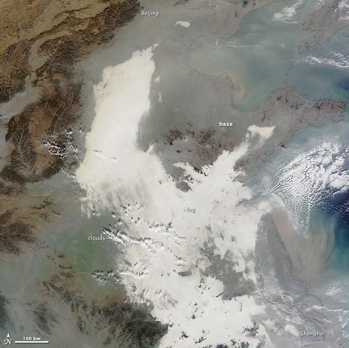 The fog has distinguishing features that makes it appear grey and smooth on the images. Ground-based sensors reported a level Particulate Matter smaller than 2.5 microns in the air to be as high as 480 and 355 per cubic meter of air in Beijing and Shanghai. WHO considers levels below 25 to be safe. The Air Quality Index was also with more than 800% above what is considered good.