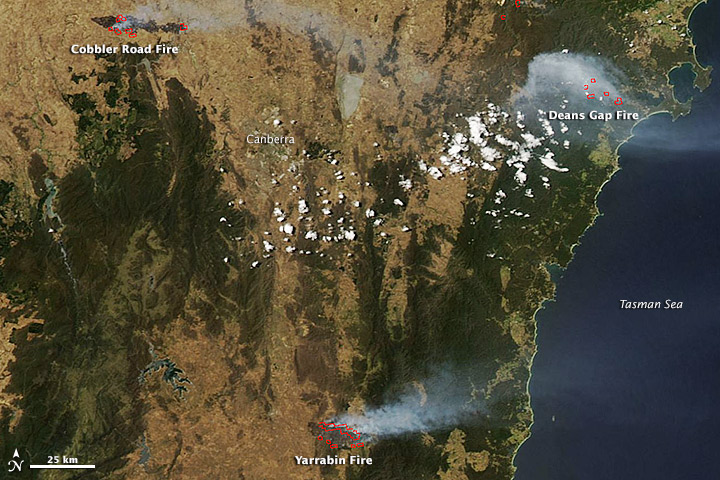 The Moderate Resolution Imaging Spectroradiometer (MODIS) on NASA’s Aqua satellite captured an image showing the large bush fires burning in eastern New South Wales, Australia, on 9 January 2013. Red outlines indicate hot spots where MODIS detected unusually warm surface temperatures associated with fires.